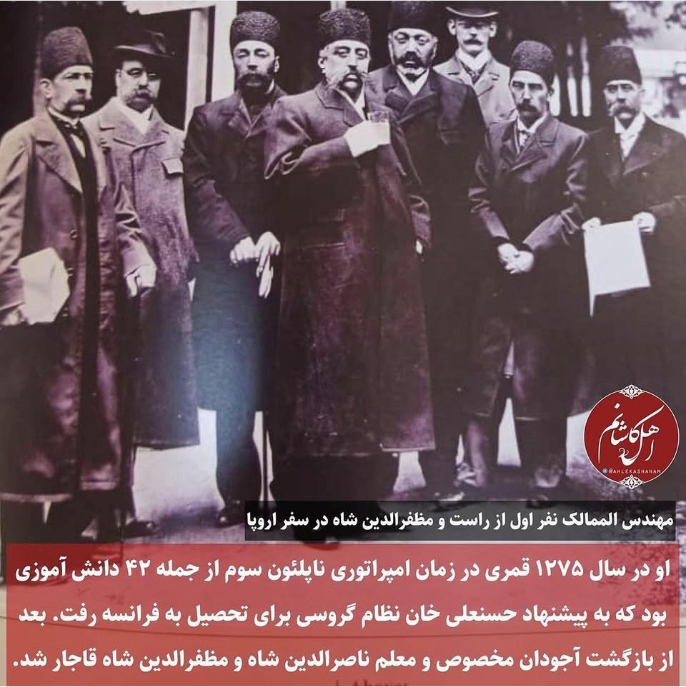 Mirza Nezam ed-Din Mohandes ol-Mamalek Ghaffari was the cousin (PesarAmoo) of Farrokh Khan Amin Dowleh. His father was Mirza Ebrahim Khan. During his adolescence, was sent to Europe to study at the Ecole Polytechnique de Paris in the field of Mining and Mathematics. On his return from Europe he remained unemployed for some time, but later he worked as an interpreter in the Chancellery. Then he attained the rank of colonel. He returned to Europe, but this time as an arms buyer. Back in Iran, he was appointed tutor to the Crown Prince. Then he was commissioned to mine gold in the region of Kuh Zard and Nasser ed-din Shah put him in charge of the construction of the road leading from Tehran to Amol. The road in question was completed three years. later and he undertook, with the title of Royal Engineer, the construction of the road from Tehran to Ghom.