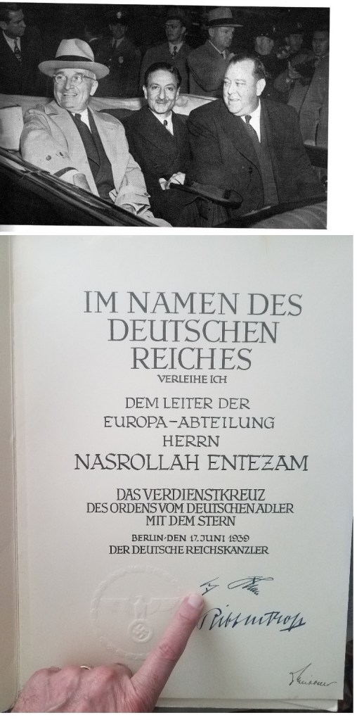 In that capacity he was sent several times to Germany in in late 1930s to meet with Hitler and Von Ribbentrop. Nasrullah served as Ambassador to Switzerland, France and twice to the US. During the Eisenhower and during the Truman administrations. He was appointed as the 5th President of the General Assembly of the United Nations. the first and the last time an Iranian was appointed to that post by the member legation.